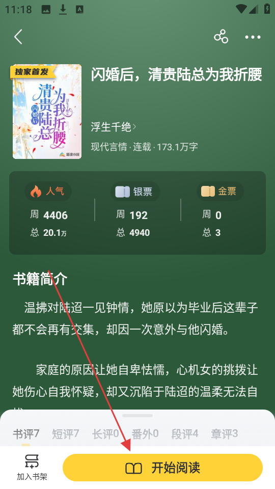 2、在小说详情页面,点击【开始阅读】按钮,进入小说阅读页面,可找到听书功能入口哦。