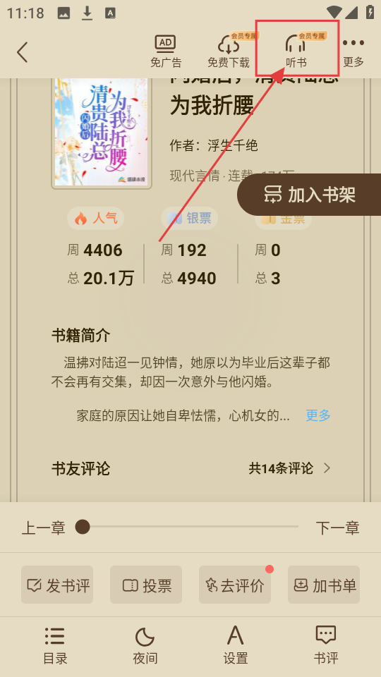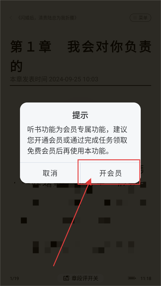 3、在小说阅读页面,点击【听书】按钮,若想使用听书功能,需先确认是否为会员呢。