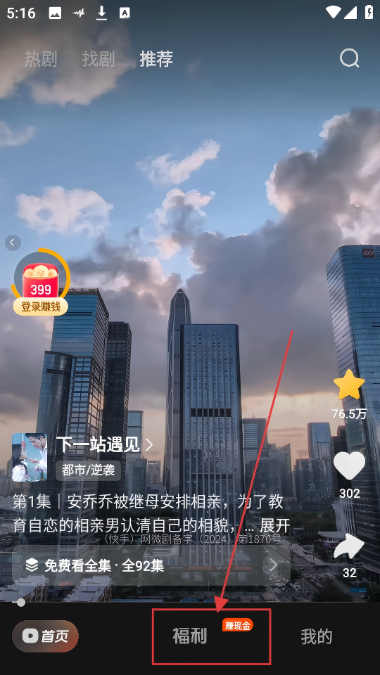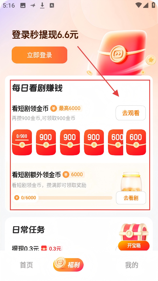 2、进入福利页面后,能看到【每日看剧赚钱】板块,完成看短剧任务可领金币哦。