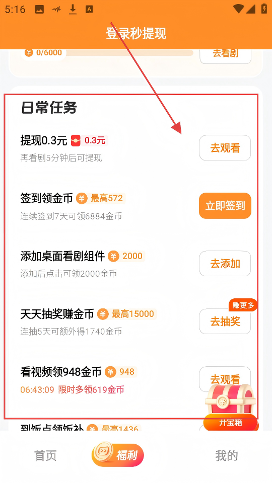 3、在福利页面的【日常任务】板块,完成签到、添加组件等任务,能获取更多金币呢。
