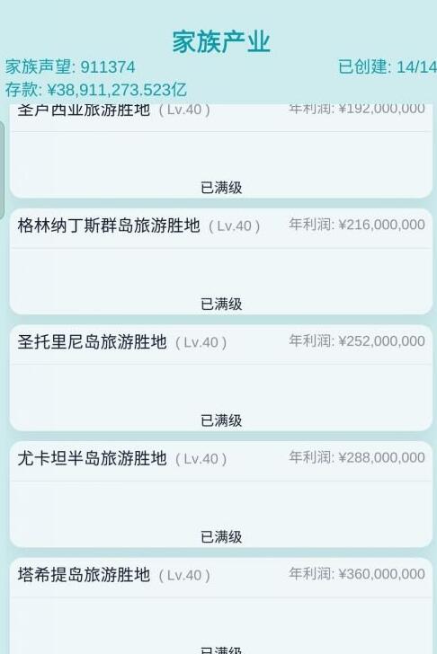 2.有钱就可以开家族企业了,能开第一个就会有第二个,全部开满有29亿的收入,岛的收入是最大的,有一定资金后可以选择先开岛