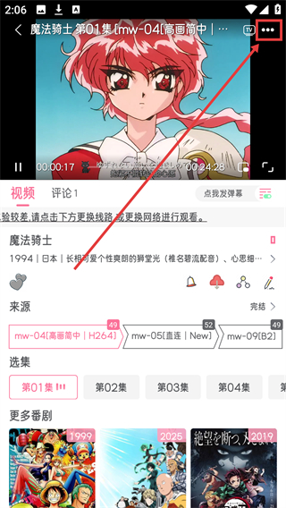 2、进入番剧播放页面后,点击右上角三个点图标,可打开播放设置菜单啦。