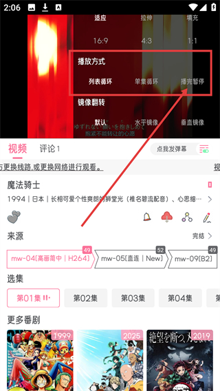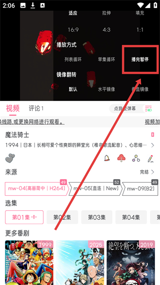 4、选择【播完暂停】播放模式后,番剧播放完当前集就会暂停啦。
