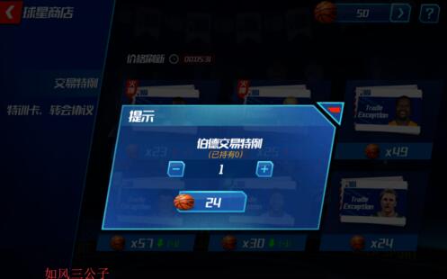 点击某个球员的交易特例后,此时会弹出对话框,玩家获得一个交易特例需要24个橘色球,只要此时玩家拥有足够多的橘色球,此时就能获得该球员的交易特例了。