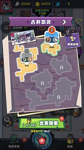 3、点击右下角【探索】,可以看到很多的地点和关卡,点击【出发探索】可以获得碎片或者认识招募更多鬼精灵来鬼屋上班,碎片可以合成获得进阶鬼怪,很有用。