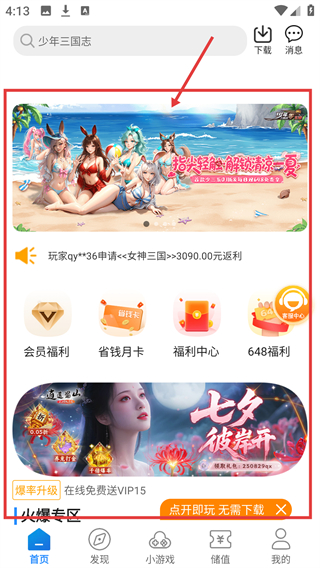 1、在首页点游戏横幅能进入对应游戏详情页,后续可查看游戏信息并选择云玩或下载啦。