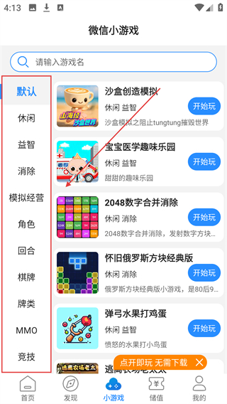 3、点底部【小游戏】按钮能进入微信小游戏专区,选分类找喜欢的小游戏,点“开始玩”就能体验啦。