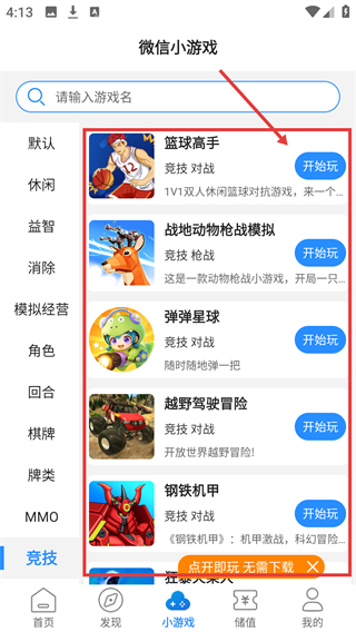 4、在小游戏专区选【竞技】分类,能看到多款竞技类小游戏,点对应“开始玩”就能直接游玩啦。