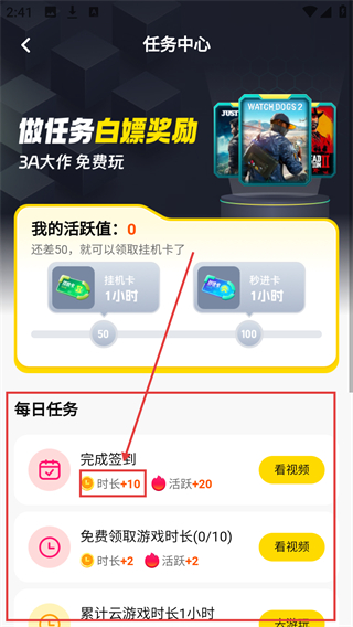 3、在任务中心,完成每日任务如【完成签到】,可获得时长和活跃值,积累奖励呢。