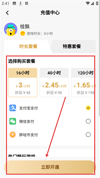 4、在充值中心,选时长套餐和支付方式后点【立即开通】,即可购买游戏时长哦。