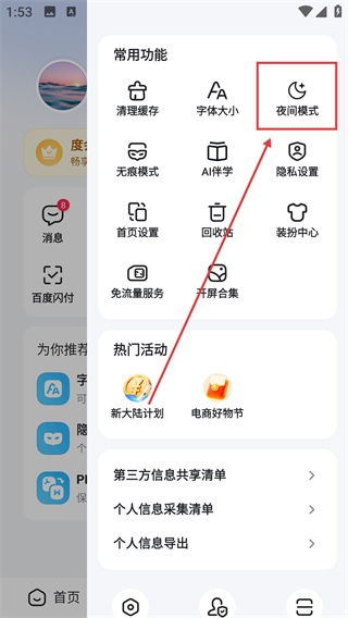 3、在展开的功能列表里,点击【夜间模式】选项,即可将APP界面切换为夜间显示模式,适配暗光环境呀。
