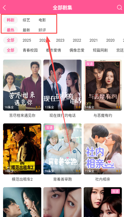 3、点进“全部剧集”里面,像“韩剧”啊“最热”啊,多点点换着筛选,很快就能把像“背着善宰跑”这种好剧给挑出来。