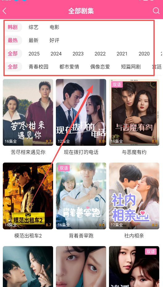 3、在“全部剧集”页面,你可以通过“韩剧”、“电影”等类型标签进行初次筛选,再利用“最热”、“最新”或年份选项进行精细筛选。
