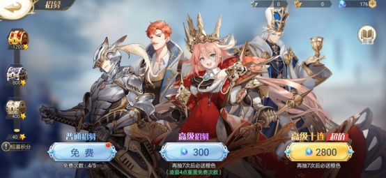 高级招募:每天1次免费招募;300钻石/次,每次招募可获得积分*10;抽取20次必得橙色英雄