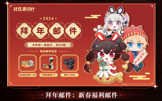 而新的一年当然要好事连连,指挥官还可以在大年初一至初三,收到来自官方的拜年邮件,每封邮件包含活动研发券*888、中型血清组β*8、螺母*8888,三封开年邮件“红包”恭祝大家新年快乐。