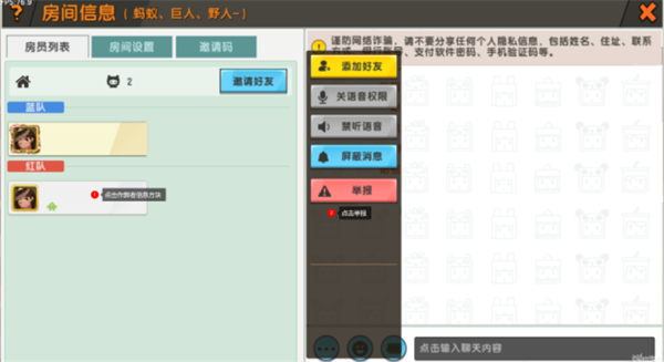 2、在房间信息左侧玩家列表中,找到作弊玩家后点击信息方块,然后点击进行【举报】。