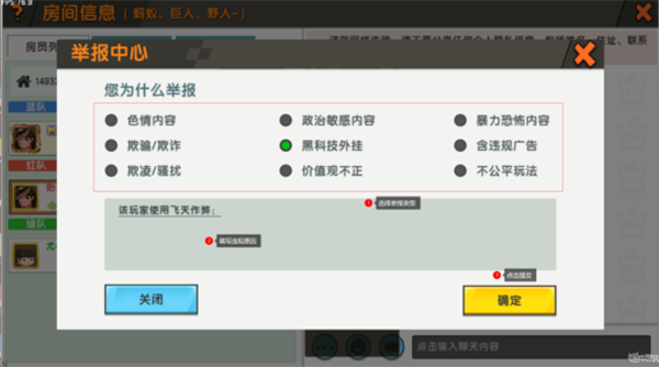 3、举报类型选择“黑科技外挂”,下方输入框内填写上该玩家具体的作弊内容,然后点击【确定】就可以了。