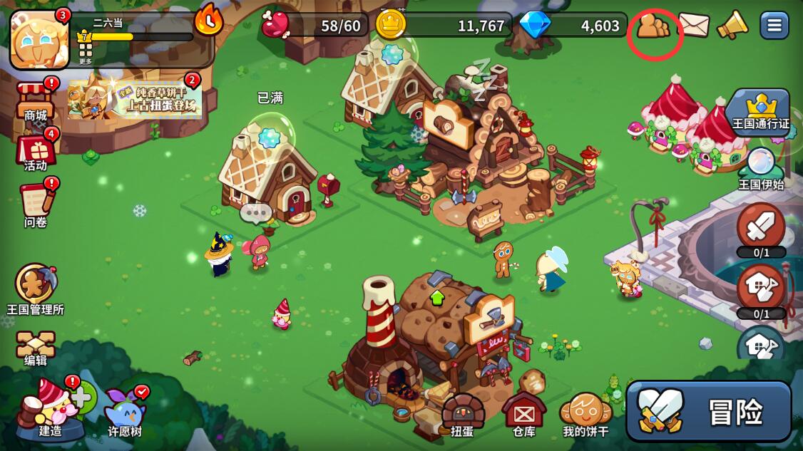 1、首先回到冲呀饼干人王国主界面,然后找到好友图标