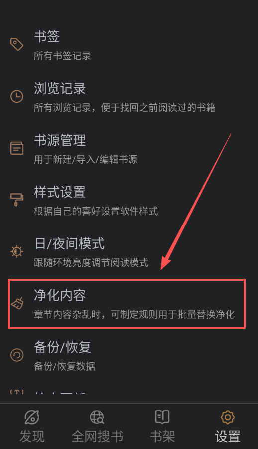 2、利用好净化与书源管理两大工具,前者优化阅读内容,后者拓展书籍来源,双管齐下。