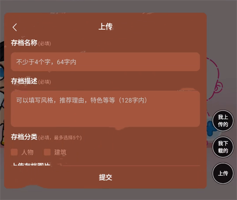 4.如果想要上传自己的人设存档,点击存档菜单右下角的【上传】,输入相应的名称和描述提交即可。