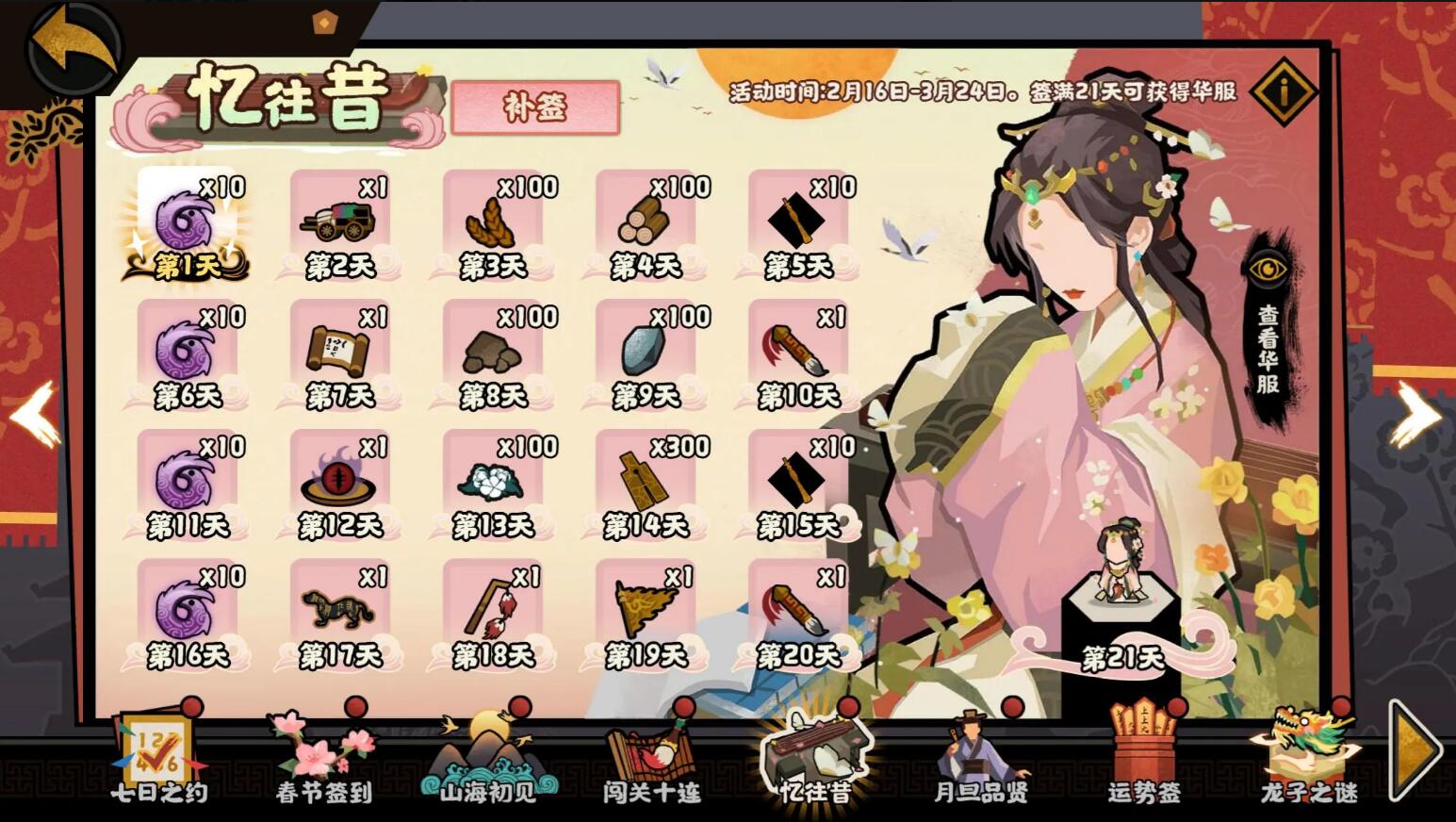 活动期间完成签到,即可获得龙须笔、物资车、烛龙之眼等道具奖励,还有名臣信物「妇好·头巾」,以及天级名臣自选礼包,可选「灵珠降生-哪吒」或者「百家宗师-姜尚」。