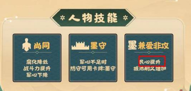 2、使用墨子等名臣的技能,可用来提升民心,比如墨子的兼爱非攻技能就能提高民心。