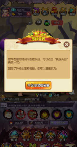 3、如果在规定的时间内没有消灭boss,系统会自动为玩家退回到上一层关卡进行刷怪。直到玩家手动点击挑战boss!