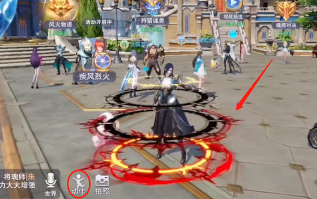 1、在游戏玩家是可以展示自己的魂环的,首先在聊天框的旁边有一个动作,点击进去。