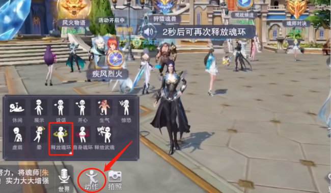 2、打开之后,里面除了有有一些简单的动作之外,还有释放魂环这一项,我们只需要点击就可以显示自己的魂环了。
