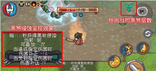在魔法大陆或东方大陆的冒险中,黑煞力量会出现在黑煞关卡和试炼之地,小骑士在上述两个地方每隔一段时间就会受到黑煞侵蚀,实力将受到不同程度的削弱,每层侵蚀将会降低小骑士的伤害并增加小骑士受到的伤害。侵蚀状态可以被叠加,在层数越高的黑煞关卡或试炼之地,获得侵蚀的速度越快。