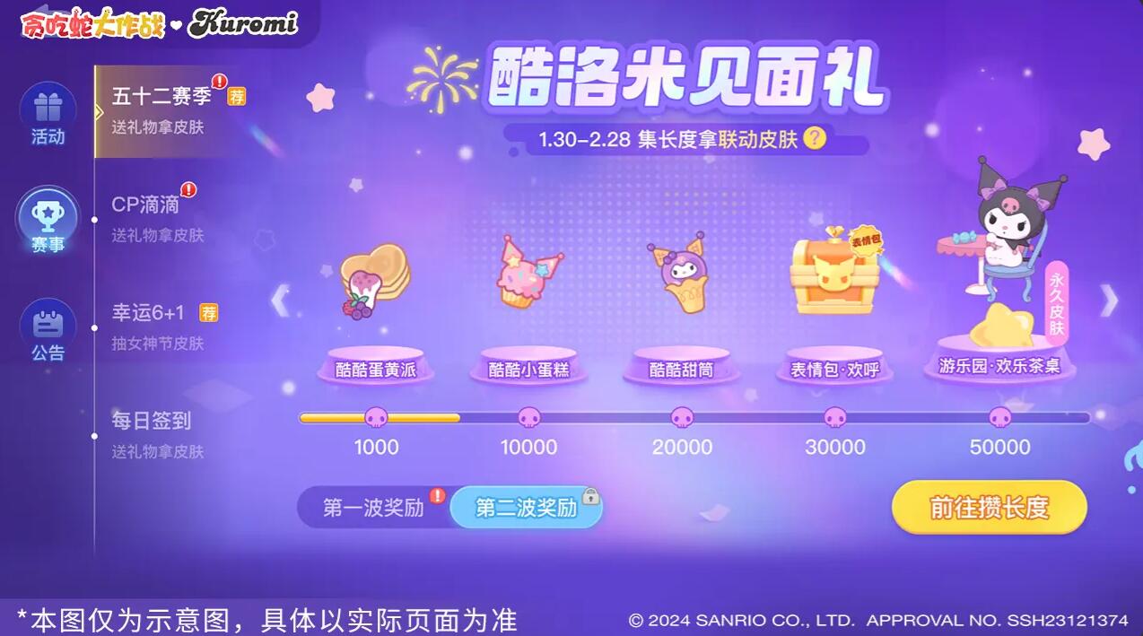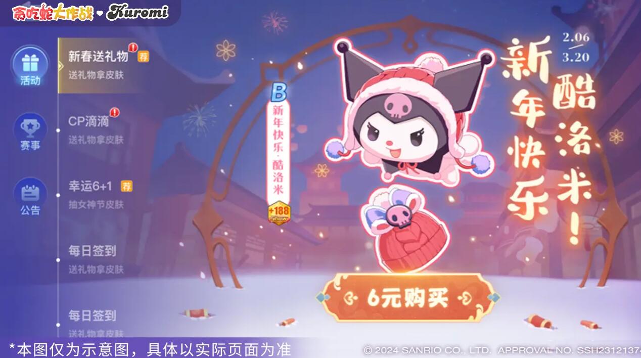 1月30日,酷洛米驾到,给蛇宝们准备了一份见面礼。专属皮肤、表情包、击杀效果,超值豪礼送不停,就等你来哦~专属皮肤是专为蛇宝们打造的个性化装扮,表情包让你的蛇宝更加生动有趣,击杀效果让你成为全场焦点!