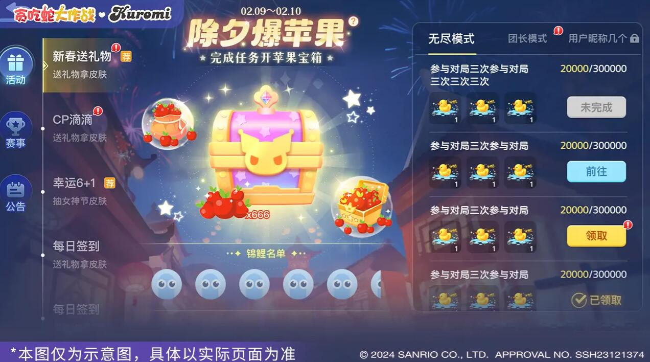 2月9日,阖家团圆日,蛇宝们准备接福利啦,惊喜爆爆爆!指定时间上线,即可领取除夕礼包,获得苹果奖励,更有机会抽取大奖哦!在新的一年里,希望这些好礼,伴随蛇宝们获得更多胜利~