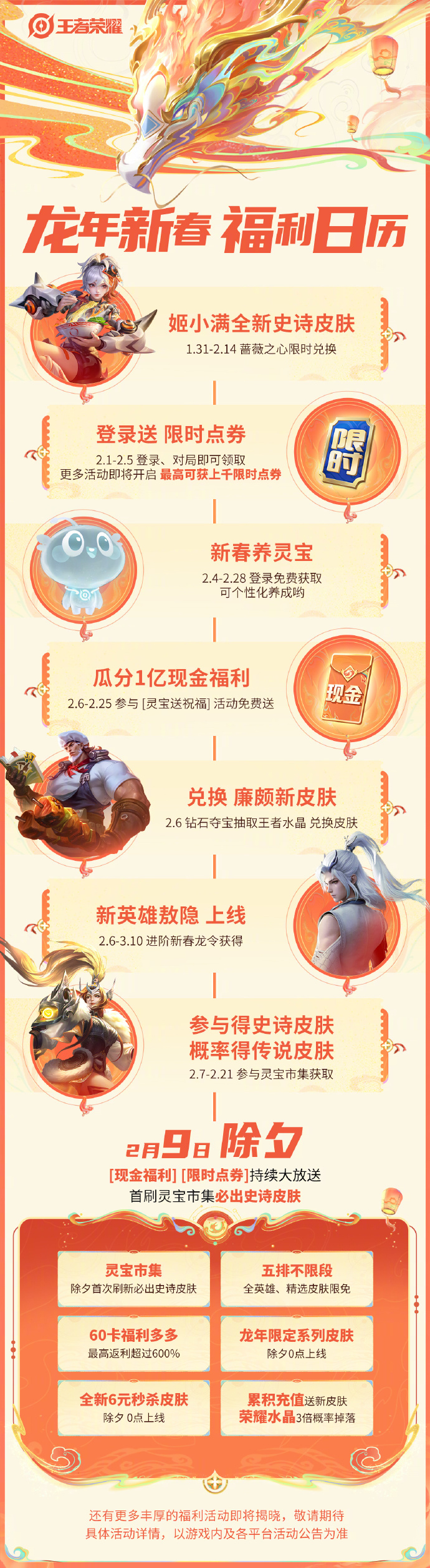 2.9除夕 现金福利、限时点券持续大放送,首刷灵宝市集必出史诗皮肤,龙年限定系列皮肤、6元秒杀皮等也将惊喜上线!