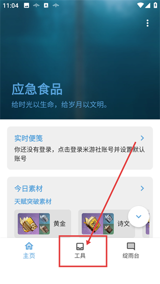 1、在【应急食品】主页点击底部【工具】选项,就能进入工具页面,找到抽卡记录分析等功能啦。