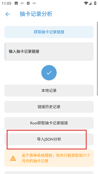 3、在抽卡记录分析页点击【导入JSON分析】选项,就能打开文件选择界面,选择对应的JSON文件啦。