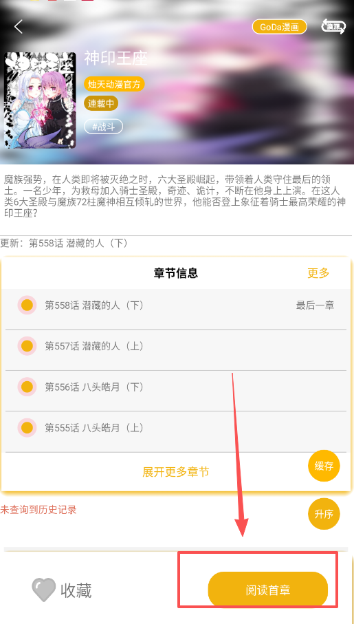 2、找到想看的漫画后,比如进入“神印王座”的详情页,这里会显示简介和最新章节,你可以直接点击“阅读首章”开始看。