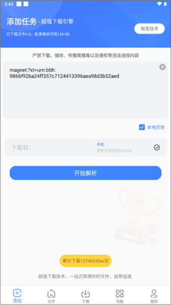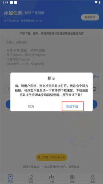 1、打开app之后会有一个磁力链接供你测试,点击右下角的尝试下载。