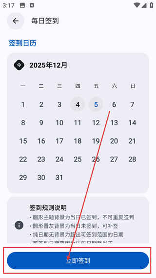 2、进入每日签到页后,点击底部的【立即签到】按钮,就能完成当日的签到操作,获取对应的奖励哦。