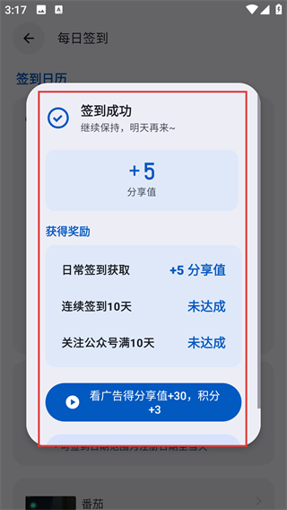 3、签到成功后会弹出提示框,显示获得【+5分享值】,还能选择看广告额外获取更多分享值和积分哦。