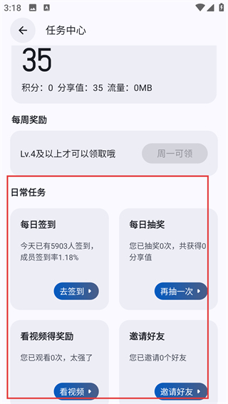 4、进入任务中心页,可看到日常任务板块,点击对应任务的按钮就能完成任务,获取更多奖励啦。