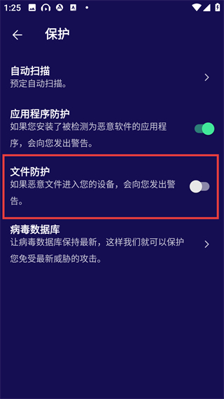 4、进入保护页面后,可开启【文件防护】功能,这样恶意文件进入设备时就会收到警告啦。