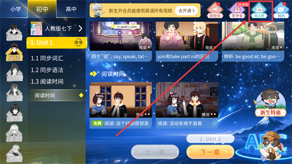 1、在学习主界面,点击右上角的【练测】选项,就能进入练习与测试的功能页面啦。