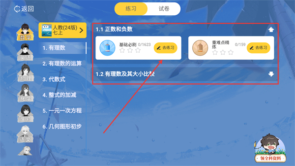 2、进入练测页后,选择对应知识点的【基础必刷】选项,点击【去练习】就能进入题目界面哦。