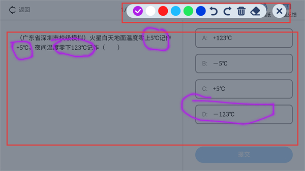 4、使用草稿纸时,可通过顶部工具选择颜色、画笔等,在题目区域标注思路后再答题哦。