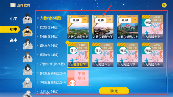 2、进入选择教材页面后,选定目标学科与教材(如【人教版七下-英语】),点击【确定】即可切换至该教材的学习界面哦。