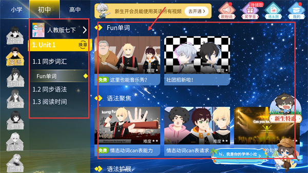 3、切换教材后,在学科学习页选择对应单元的知识点(如【Fun单词】),点击对应的视频卡片,进入学习内容页面呀。