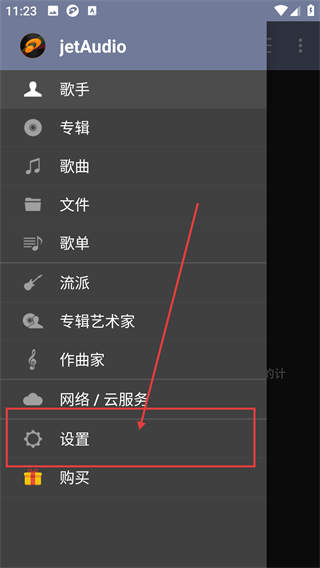 1、在【jetAudio】的侧边栏菜单里点击【设置】选项,就能进入应用的设置页面,调整各类功能参数啦。