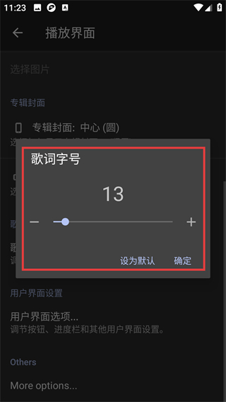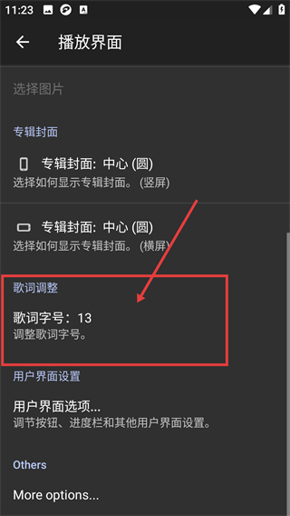 3、在播放界面页找到【歌词字号:13】选项,点击它就能打开歌词字号的调整面板,修改显示大小啦。