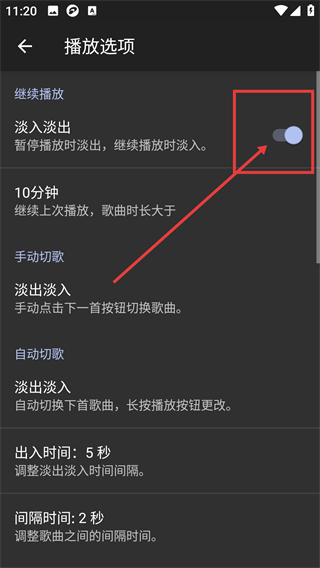 4、在播放选项页面找到【淡入淡出】开关,开启它就能让播放暂停和继续时呈现淡入淡出的音效啦。