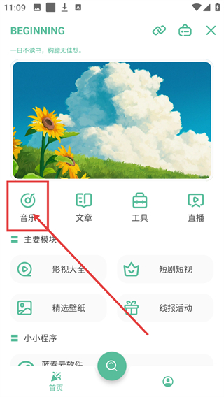1、在首页,点【音乐】选项,可进入音乐板块,查看各类音乐榜单和内容,开启听歌之旅哦。